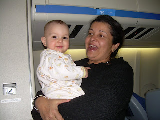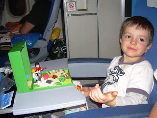 C'est en gros le temps que cela a pris pour nous rendre en avion de Montréal à Delhi , en comptant l'escale de trois heures à Amsterdam. Deux vols qui se sont relativement bien passés: les deux enfants ont réussi à dormir quelques heures, Bébé plus que Grand-Frère. Nous étions dans la dernière rangée de l'avion et une bassinnette était installée au dessus de nos têtes. Papa et Maman s'en sont plutôt passés car il fallait tout de même veuiller au grain sur le petit monde. Léonard a été particulièrement extraordinaire, ayant été relativement calme durant les deux vols. On prévoyait que la réclusion allait lui donner envie de sauter partout après 7 heures de vol mais il n'en fut rien. Mais, à bien y penser, avec les nouveaux systèmes vidéos intégrés dans chaque banquette, quel enfant de nos jours ne rêverait pas de passer plusieurs heures à regarder son film préféré, à boire du jus de pomme sur demande ou à avoir à sa portée papa et maman qui n'ont pas de tâche contraignante pour les empêcher de jouer au Playmobil avec lui autant qu'il le souhaite!